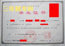 大专毕业证,透光有书本或人形水印,XLZS或GDJY激光防伪条码,由教育部门统一印制。校名章、校长章、学校编号或证书编号、姓名、性别、出生年月日、入校时间、毕业时间、专业名称、学制等内容,照片底色视年份而定。