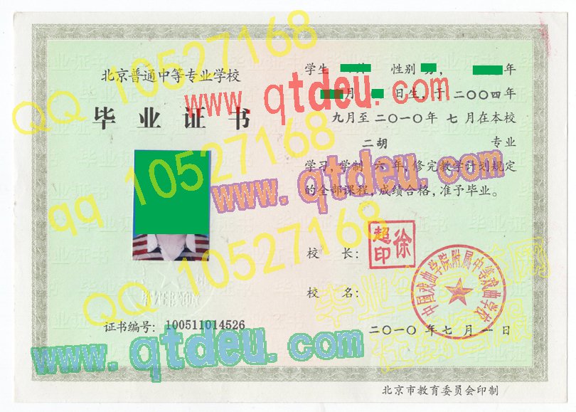 中国戏曲学院附属中等戏曲学校毕业证样板{模板},由北京市教育委员会统一印制,实物有多处防伪标识。 该学校毕业证编号规则是:年份后2位+10位随机数字。 中国戏曲学院附属中等戏曲学校2010年校长是:徐超