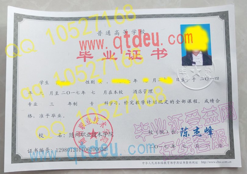 随州职业技术学院-2014年毕业证样本图,是由教育部统一印制的毕业证,纸张有多处防伪标识。